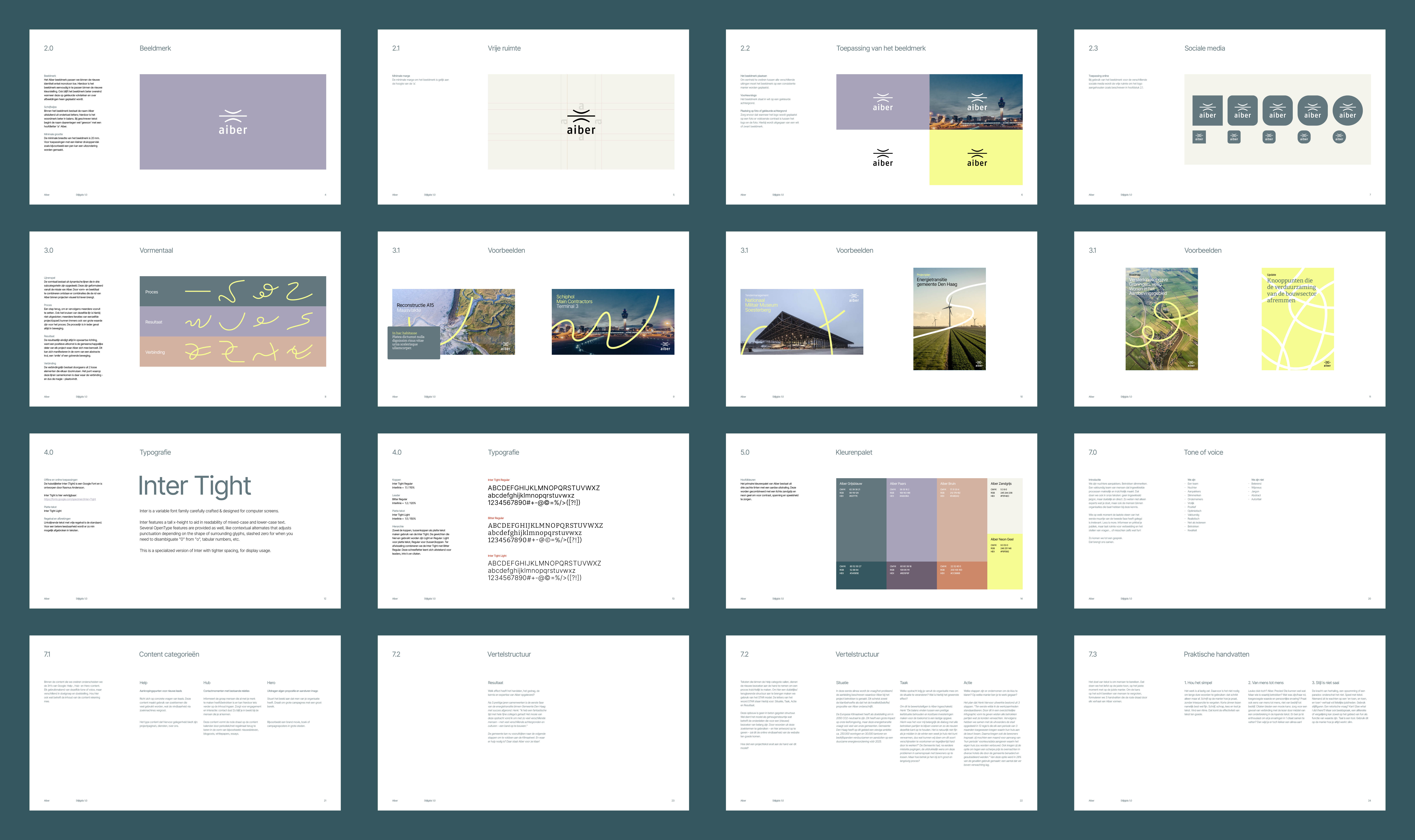 De styleguide van Aiber verduidelijkt – naast vaste items zoals logo- en kleurgebruik – de inzet van het lijnenspel dat kenmerkend is voor de visuele identiteit: waarom en wanneer kan van welke vorm gebruik worden gemaakt? Ook wordt de tone of voice uitgebreid benadrukt. In dit hoofdstuk wordt omschreven waar een typische tekst voor Aiber uit bestaat en hoe dit hoort te klinken. Op deze manier kunnen meerdere mensen bijdragen aan de content creatie voor Aiber, maar blijft de manier waarop naar buiten getreden wordt helder en eenduidig.