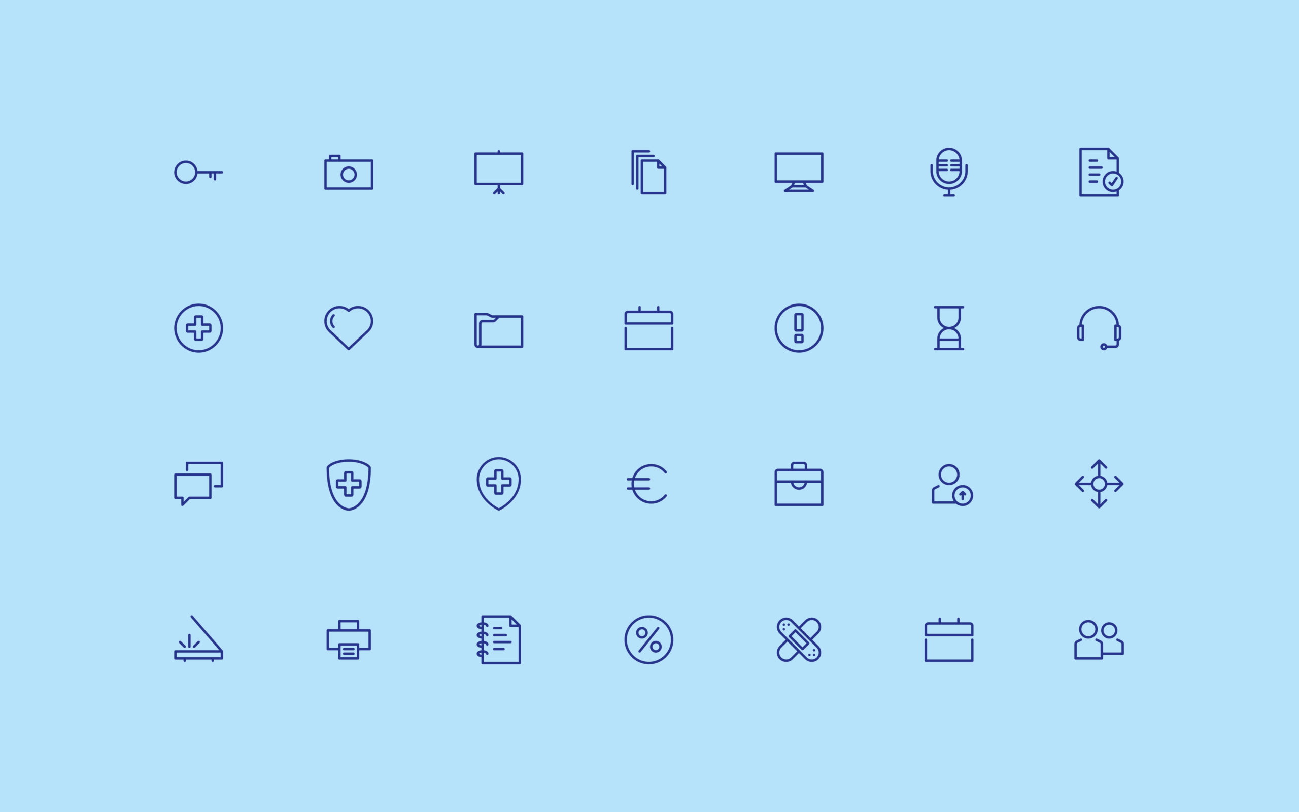 Ook is er een iconen bibliotheek opgebouwd voor de NZa. Alle iconen zijn op eenzelfde manier opgebouwd om consistentie in de uitstraling te behouden. Dit is gedaan door gebruik te maken van een duidelijk grid en ieder icoon dezelfde karakteristieken mee te geven zoals bijvoorbeeld de lijndikte en afronding.