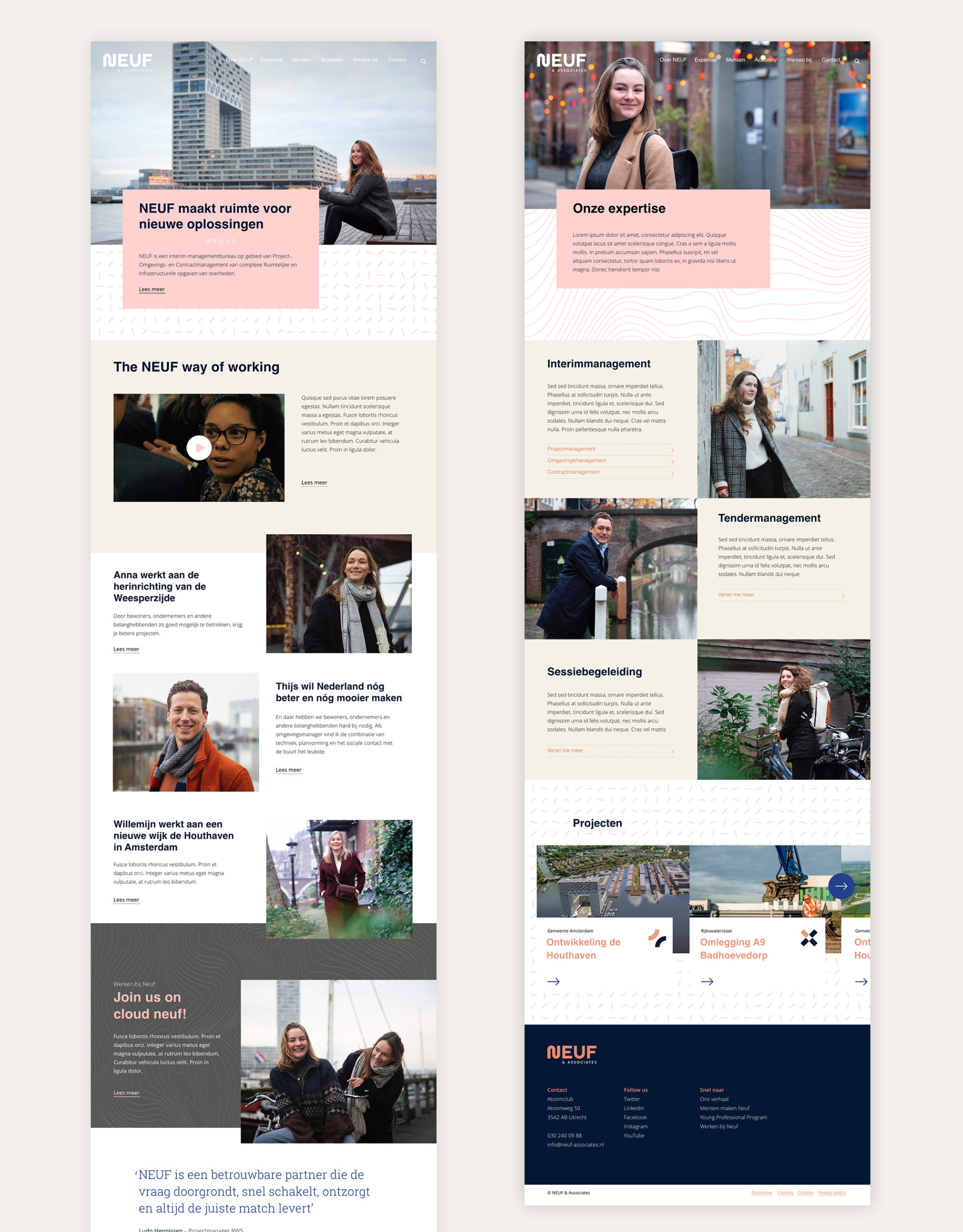 In de website spelen de mensen van NEUF de hoofdrol. In deze groep mensen ligt namelijk de essentie van de organisatie en het gezamenlijke doel. Samen werken met overheden aan complexe vraagstukken in de leefomgeving. Waar Plezier, vrijheid en kwaliteit waarden zijn die hen verbinden.